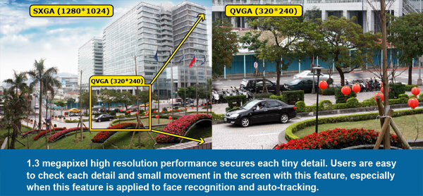 With the feature of 1.3 Megapixel resolution, Digital Smart Zoom is available for an intrusion event. The camera will zoom in on the intruder and put him on the center of the monitoring view for evidentiary recording and effective monitoring. |
